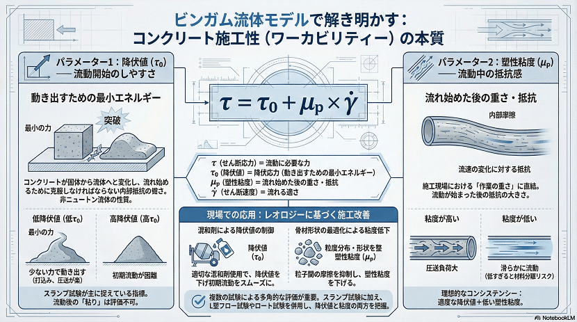 このモデルは、降伏値と粘度の両方を同時に評価できるため、施工性評価の理論的基盤として有効で、スランプ流動やポンプ打設の挙動理解に有効です。