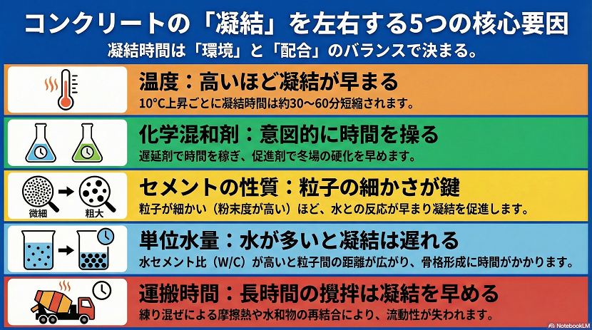 - 実務の目安: 一般にコンクリート温度が10°C上昇すると、凝結時間は約30分〜60分短縮されます。