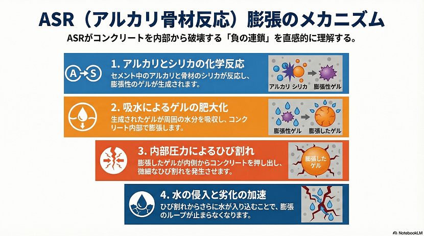 ポイント: このうち1つでも除外すれば、ASRはほぼ発生しません。例えば、アルカリ量を制御したり、無害骨材を使用することが有効です。